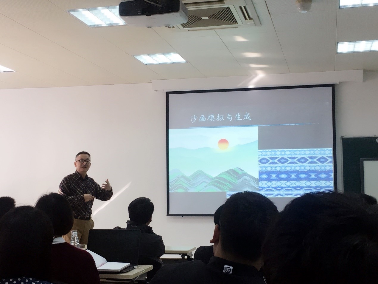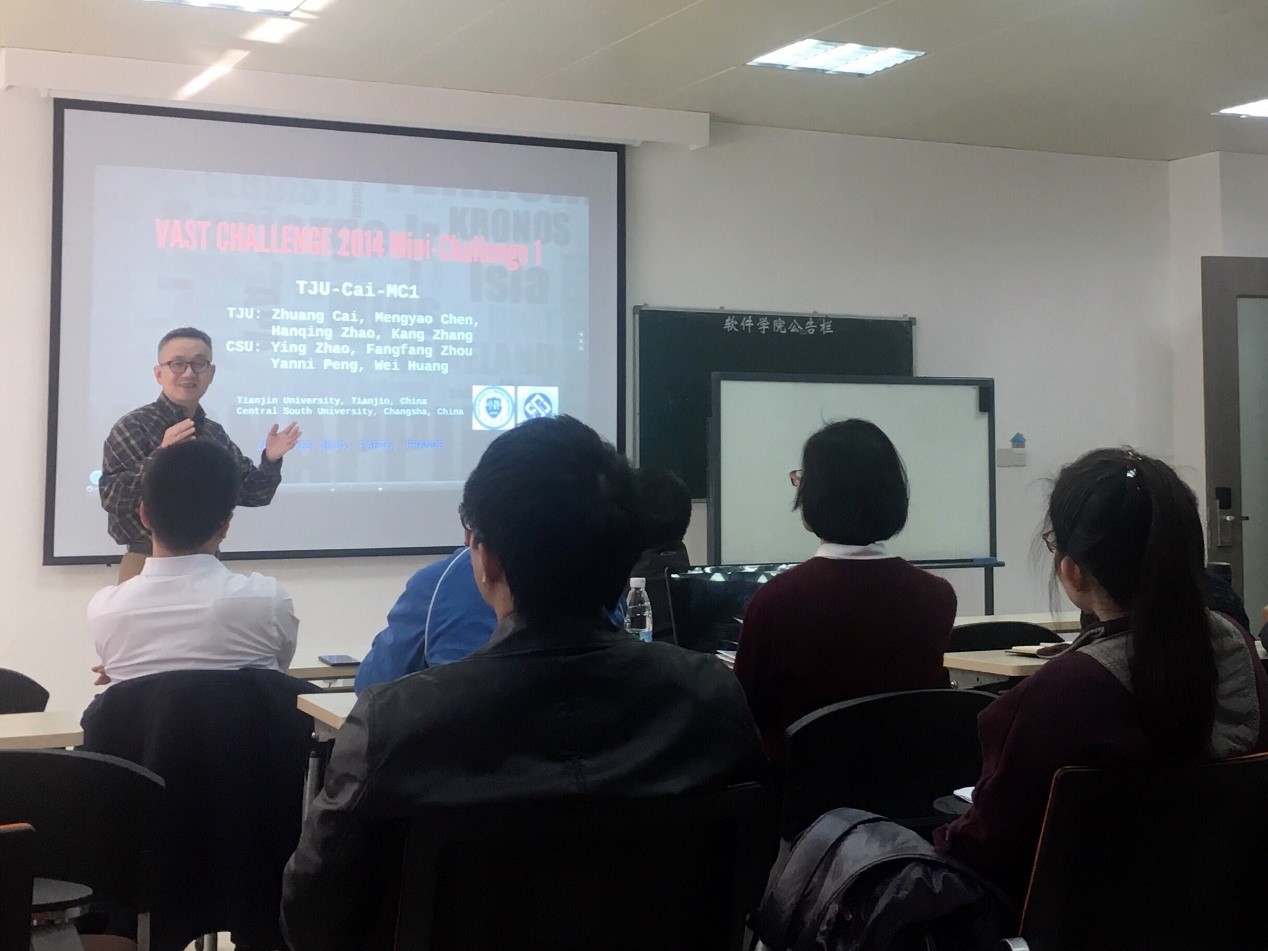 此次讲座,张老师主要介绍一种交互式可视化方法,用于直观探索球形虚拟现实环境中的网络图。同时还提出了一个参数化的5步三维边缘绑定算法和一组技术,以避免图形边缘与视点的碰撞,并用视频展示了在Oculus Rift VR系统中实现的球形交互和3D边缘绑定方法,通过两个有关实际数据和可用性实验的案例研究来证明该方法的可用性。另外,张老师简要介绍其他研究项目,包括树可视化和生成艺术,引起在场师生热烈讨论。对于老师同学们提出的问题,张老师一一耐心细致地解答,并以自身经历鼓励同学们坚持自己感兴趣的科研方向。