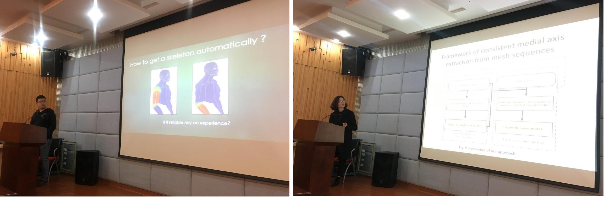 2017年3月12日,厦门大学数字媒体计算研究中心又迎来了一年一次的为期一天的学术研讨报告会。中心的各位老师和同学积极参加了研讨会,并邀请了信息学院的张俊松副教授、访问学者王荣海老师等参加,研讨会中各位老师同学进行广泛的学术交流。 学术研讨报告会中,张俊松副教授做了题目为脑电波与图像处理的特邀报告,张老师结合自身的实践经验和研究成果,为在场的老师和学生进一步开阔了学术视野。中心的博士、硕士研究生同学也都做了各自的研究报告,演讲题目涉及广泛。主要包括:虚拟现实、计算机视觉、数据挖掘和自然语言处理、计算机图形和动画、人工智能。其中,虚拟现实相关是由张晓丽和刘笑寒2位同学进行报告,涉及主题包括:360-Degree Virtual Fitting Based on Kinect和A surgical training system for four medical punctures based on VR;计算机视觉相关是由林晨晗和何豪2位同学进行报告,涉及主题有:Learning Expressionlets on Spatio-Temporal Manifold for Dynamic Facial Expression Recognition和Human Visual Attention Recognition and Interesting Region Detection;数据挖掘和自然语言处理相关是由张飚、鲍彬彬等3位同学进行报告,涉及主题有:Variational Neural Machine Translation、Research on reservoir automation prediction model、HMM-based market state forecasting trading strategy research;计算机图形和动画相关是由杨宝容老师和蓝磊等共7位同学进行报告,涉及的主题包括:Correspondence-based Approach for Consistent Medial Axis Extraction from Mesh Sequences、Medial-Axis-Based Shape Deformation with Volume Preservatio、Research and Application of 3D Reconstruction Technology in Robot Shell Customization、3D modeling for symmetry object based on single image、Texturing of Augmented Reality Character Based on Colored Drawing、Wavelet Entropy Analysis for EEG Wave Pattern、Super-pixel generation based on quadric error metrics.;