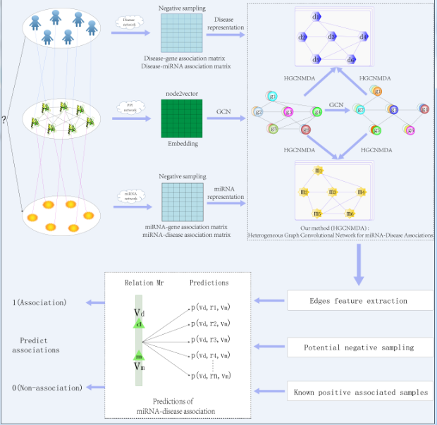本文构建了端到端的异构的图卷积神经网络用以mirna和疾病的关联预测,特征提取和链接预测同时进行,采用了新颖的负采样方法,增加了模型的鲁棒性,进一步地,case study验证了模型的性能。
