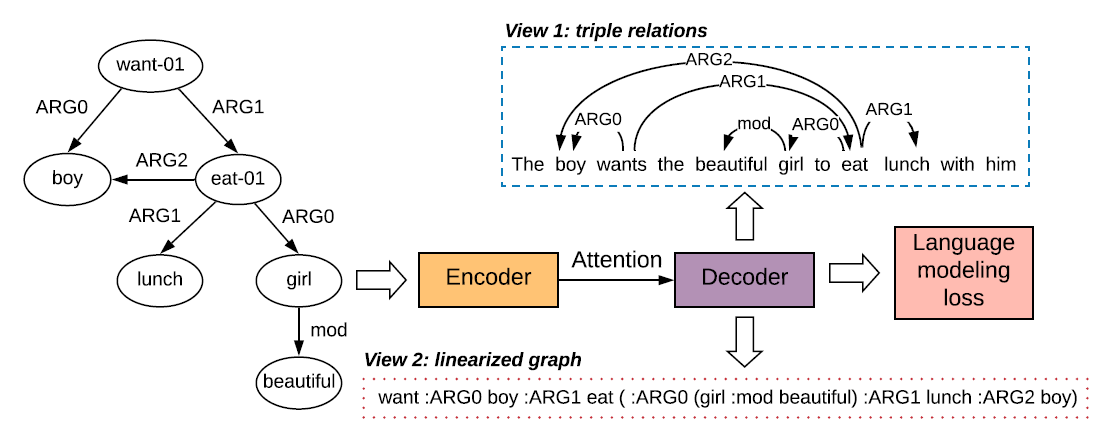本文由我中心自然语言处理研究组和腾讯AI Lab合作完成。第一作者是腾讯AI Lab宋霖峰博士,第二作者是中心2016级本科生王安特,通讯作者是苏劲松副教授。本文针对在Graph-to-Text生成过程中,结构信息难以有效保持的问题,提出通过重建自编码损失,引入额外训练信号,提高模型对图结构的信息保持能力。本文共设计了两个自编码损失:局部的三元组结构与全局的线性化图结构,并在多个任务、多个数据集上验证了该方法的有效性。