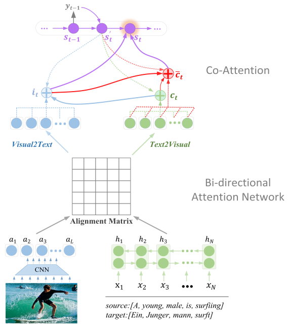 论文由中心苏劲松副教授,2018级硕士研究生陈锦昌,2020级硕士研究生蒋辉合作完成。本文主要致力于多模态神经机器翻译任务下,如何更好地进行图片和文本的语义信息交互。本文在两个方面进行了改进:① 使用Bi-Attention得到语义互相补充的文本和图片表示。② 解码端装配一个Co-Attention模块,先基于文本关注图像信息,最后再基于得到的图像信息重新关注文本表示。多个标准数据集的结果证明了本文工作的有效性。