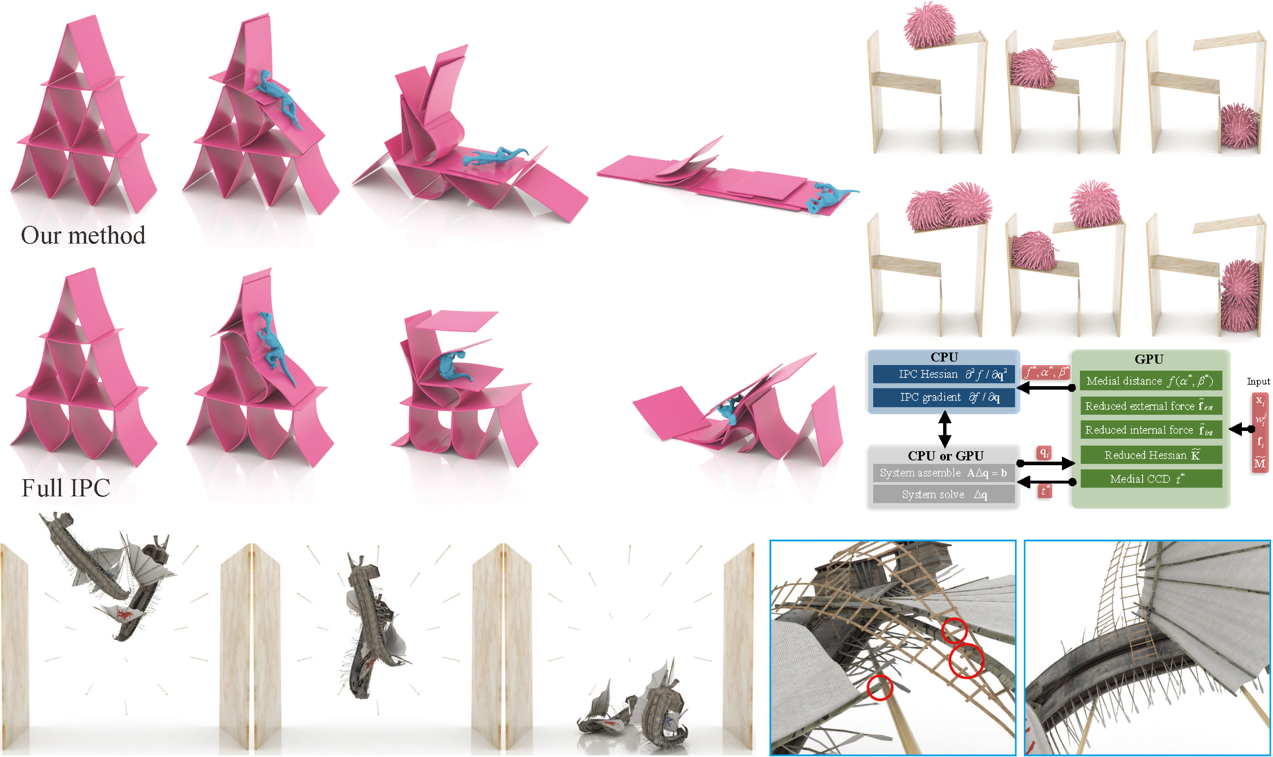 该论文针对弹性体仿真中普遍存在的作连续碰撞检测计算的低效问题,提出了一种基于中轴变换的连续碰撞检测的计算方法。该方法继承了Incremental Potential Contact (IPC)的计算框架,并将之与Medial Elastics的碰撞检测方法进行结合,将弹性体的变形及碰撞检测的计算对象迁移到由小数量级的中轴变换所构造的子空间上,提出了中轴变换体积图元的连续碰撞判别式,同时开发CPU与GPU混合加速技术,最终实现仿真效率的提升。实现结果表明,该方法比传统的IPC方法的计算速度有十几至几十倍的提升。