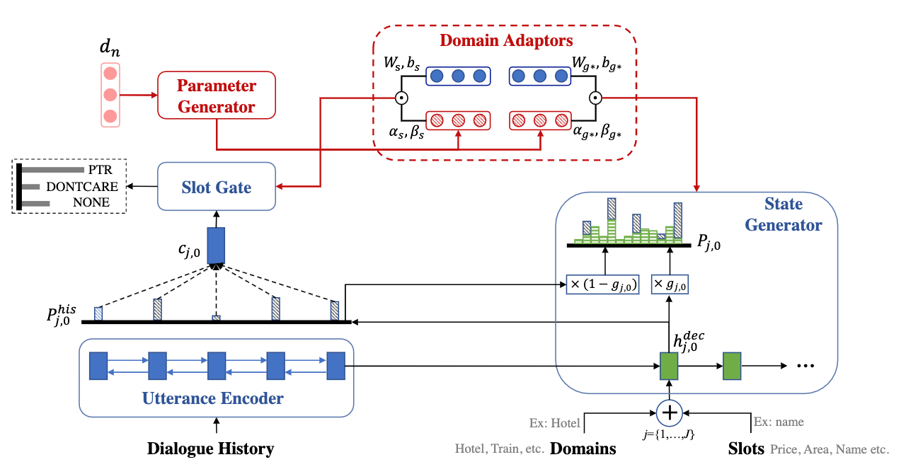 论文研究提出了一种面向低资源领域自适应的元学习算法框架以解决多领域对话状态追踪任务中某些领域的训练数据较少的情况。该框架分为基础对话状态追踪模型和领域参数建模器两个部分。训练分为两个阶段,第一阶段,领域参数建模器根据领域表示向量将领域共享对话状态追踪模型的参数在参数空间中进行偏移,第二阶段,领域共享对话状态追踪模型在目标领域的训练集上进行微调。论文以TRADE模型为基础,在五个低资源领域的对话状态追踪任务上都有不错表现。