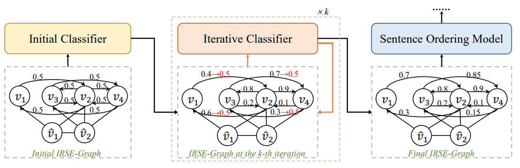 本工作以mask-predict方法迭代式预测句对顺序,并把句对顺序的预测结果应用到基于图网络的句子排序模型中,作为句子-实体图的连边权重用来显式指导全段排序。相比baseline取得显著提升,而在配备以预训练模型(如BERT)和一些其他方向前沿的网络模块可以达到state-of-the-art性能。