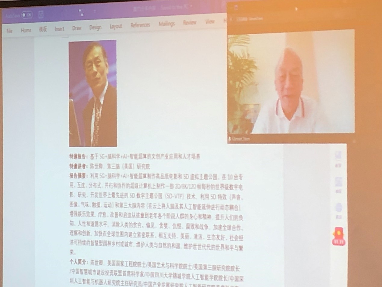 会议非常荣幸地邀请到美国国家工程院院士、超级计算机专家陈世卿进行特邀报告。陈院士报告的主题为“基于5G+脑科学+AI+智能超算的文创产业应用和人才培养”,他希望能在厦门建立一个大的文创产业,利用5G+脑科学+AI+智能超算制作高品质电影和5D虚拟主题公园。制作高品质电影是希望能够培养优秀的编剧人才和制作人才,将中国传统文化故事用好莱坞的技术拍出阿凡达那样的大片,占据世界电影市场。制作5D虚拟主题公园是希望能设计出数字化的迪士尼乐园,通过脑科学和人工智能技术找到人脑的兴奋点,使得游客在5D虚拟主题公园中畅游,获得生理和精神上的舒适。