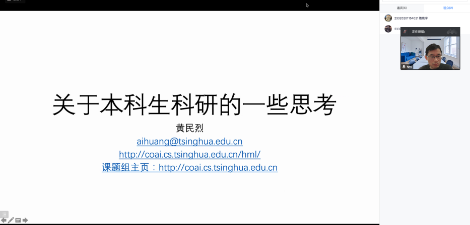2021年12月27日,应我中心苏劲松老师邀请,清华大学计算机科学与技术系长聘副教授黄民烈博士,带来题为“本科生培养中的一些思考和体会”的线上讲座。讲座由苏劲松老师主持,多名老师、博士生、硕士生及本科生参加了讲座。
