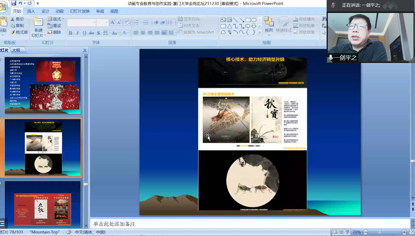 北京电影学院动画学院院长李剑平教授从动画专业教育与创作实践的角度出发,展示了一系列动画作品。