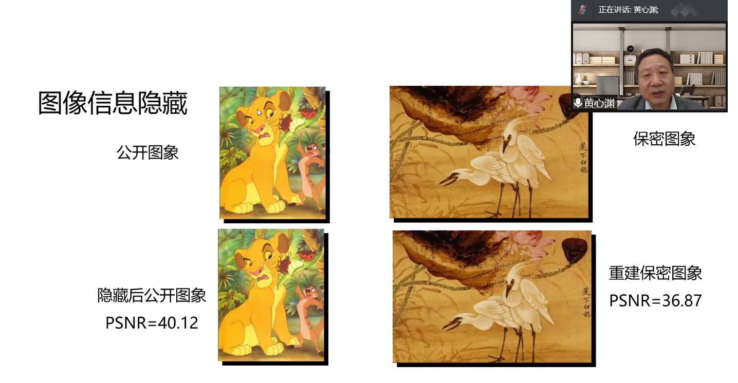 中国传媒大学动画与数字艺术学院院长黄心渊教授介绍了智能处理技术在音像处理中的应用,包括图像信息隐藏、智能创作等。