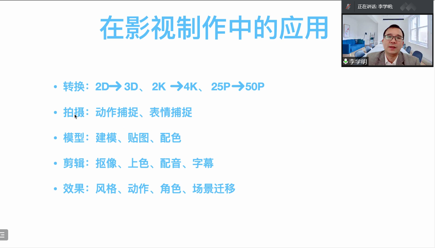 北京邮电大学数字媒体与设计艺术学院李学明教授从人工智能基本概念展开,介绍了人工智能在影视制作的应用,包括动作捕捉、场景迁移、抠像剪辑等。