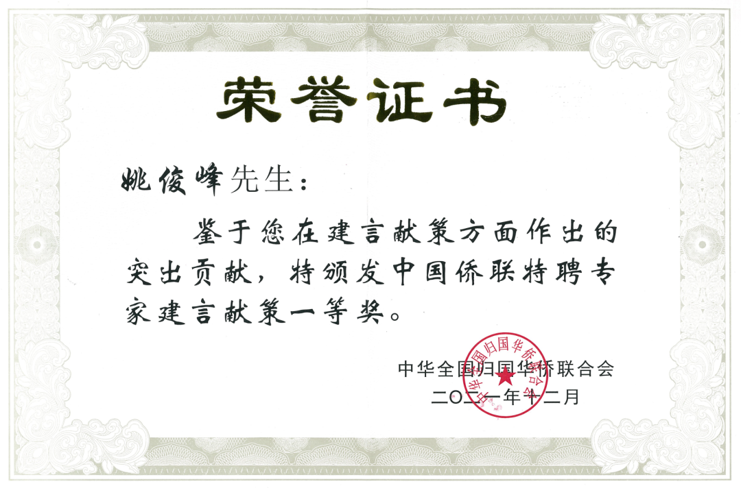 近日,2021年中国侨联特聘专家委员会对在建言献策领域获得务实成果的专家学者进行了表彰。我中心姚俊峰教授荣获2021年度中国侨联特聘专家委员会建言献策奖一等奖。