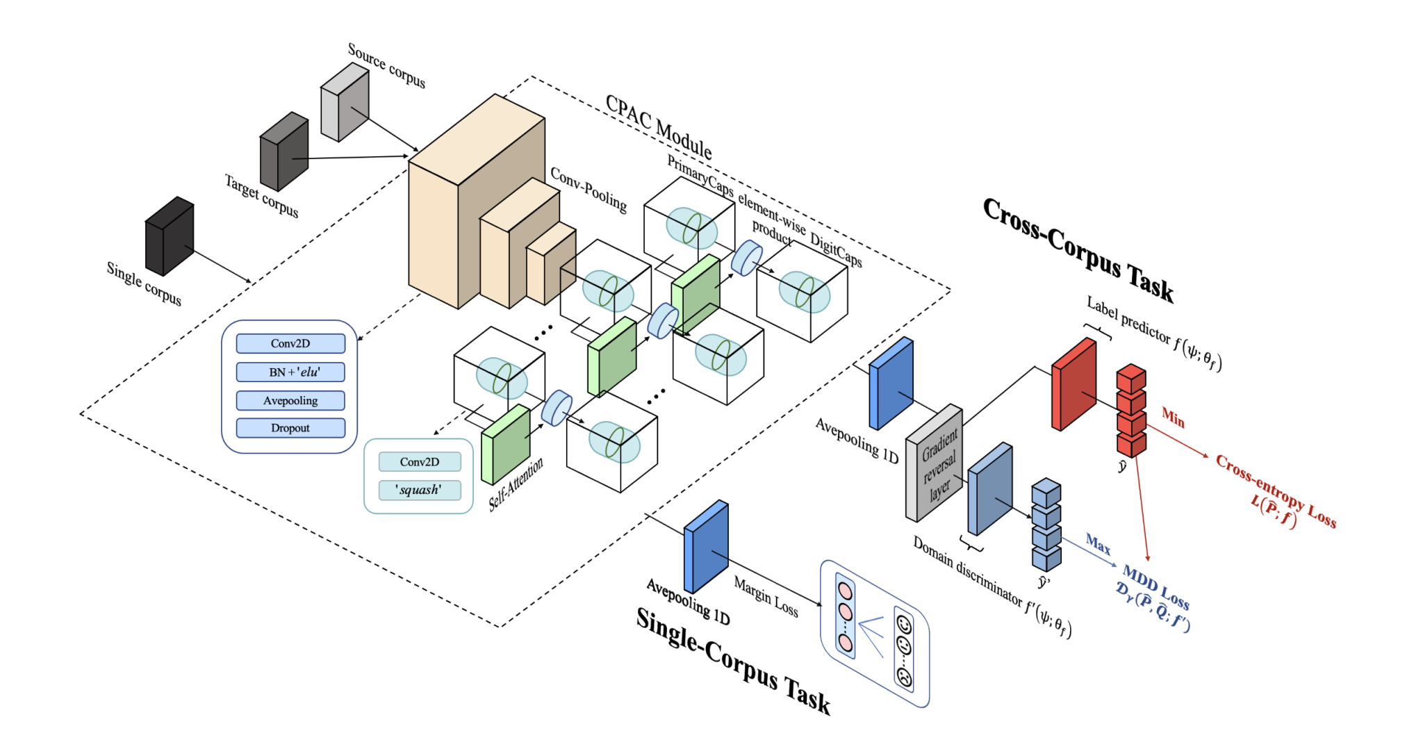 为了应对这一挑战,本文通过在胶囊网络中嵌入自注意机制,设计了卷积-池化和注意力胶囊模块的组合,可以通过关注输入不同胶囊的重要特征来增强高阶特征的判别能力。此外,为了处理跨语料库的任务,本文提出了一个语料库适应对抗模块,在卷积-池化和注意力胶囊模块融入间隔差异散度,提取强情感共性特征,有效增强域不变情感表征。论文使用了四种著名的语音情感识别数据集,进行了单语料库和跨语料库任务的实验。基于包括消融实验和可视化分析,有效验证了在这两项任务中,本文提出的方法与一些最先进的方法相比,在所有情况下都显示了更好的性能。