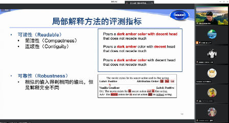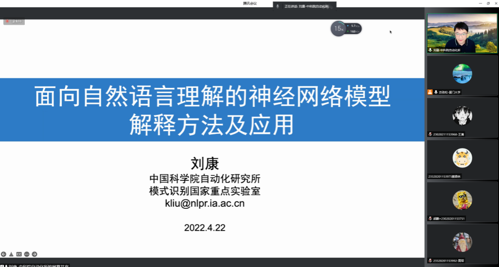 2022年4月22日,应我中心苏劲松老师邀请,中科院自动化研究所刘康研究员,带来题为“面向自然语言理解的神经网络模型解释方法及应用”的线上讲座。讲座由苏劲松老师主持,多名老师、博士生、硕士生及本科生参加了讲座。