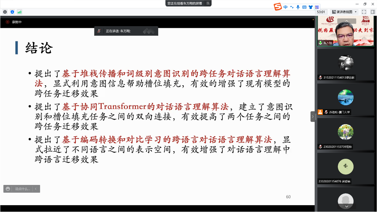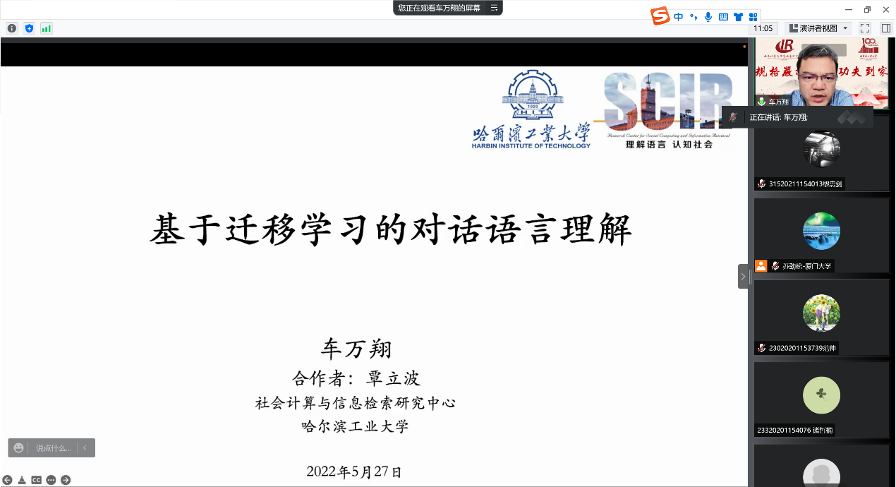 2022年5月27日,应我中心苏劲松老师邀请,哈尔滨工业大学车万翔教授带来题为“基于迁移学习的对话语言理解”的线上讲座。讲座由苏劲松老师主持,多名老师、博士生、硕士生及本科生参加了讲座。