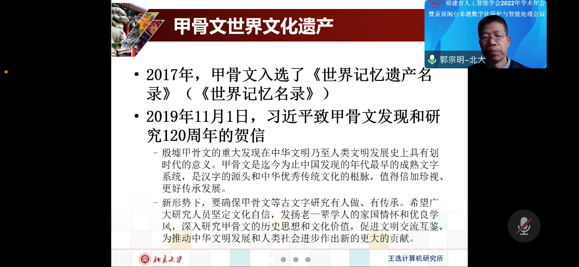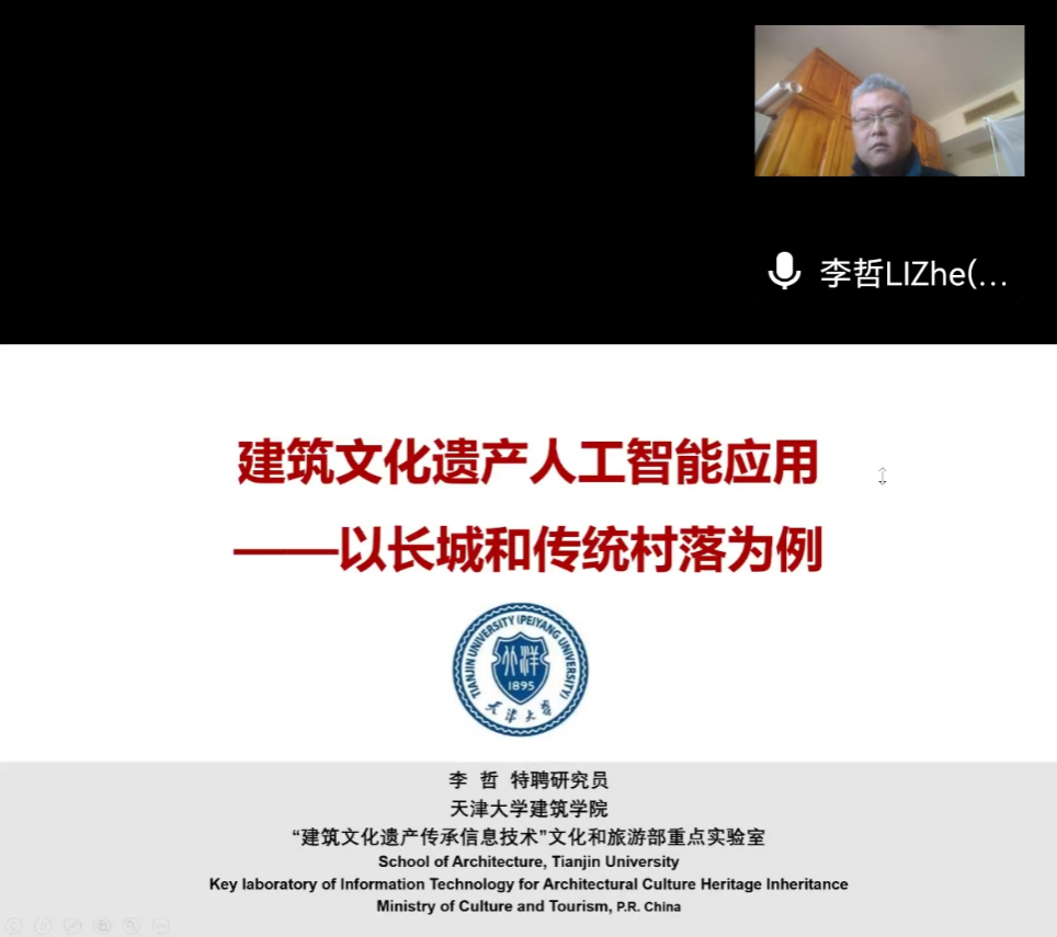 年会还特邀了北京大学郭宗明教授、浙江大学于金辉教授、天津大学李哲研究员分别作“汉字字体与人工智能”、“文化遗产建模与绘制”、“建筑文化遗产人工智能应用——以长城和传统村落为例”等专题报告。