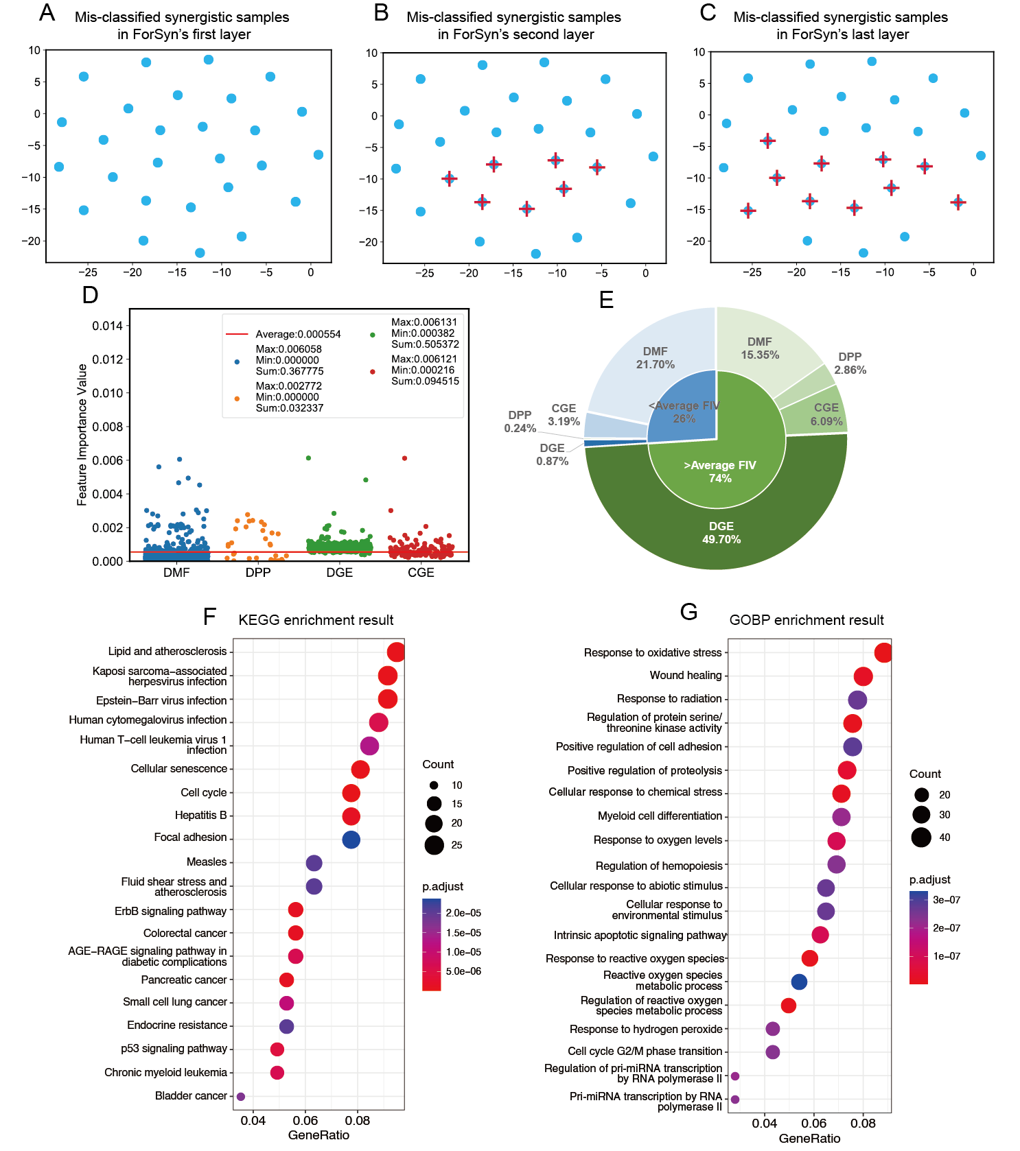 此外,ForSyn具有可解释性,可以计算输入的每一维特征数据对于预测过程的贡献。通过特征重要性评估,提取出了在协同作用预测中具有关键作用的特征,从三个方面进行了系统分析,包括与预测过程的关联、特征类型的贡献、关键特征的生物分析(图2)。分析发现药物的转录组数据对于预测具有突出贡献,药物可以通过调节关键基因的转录表达推动联合用药的协同或拮抗效果。