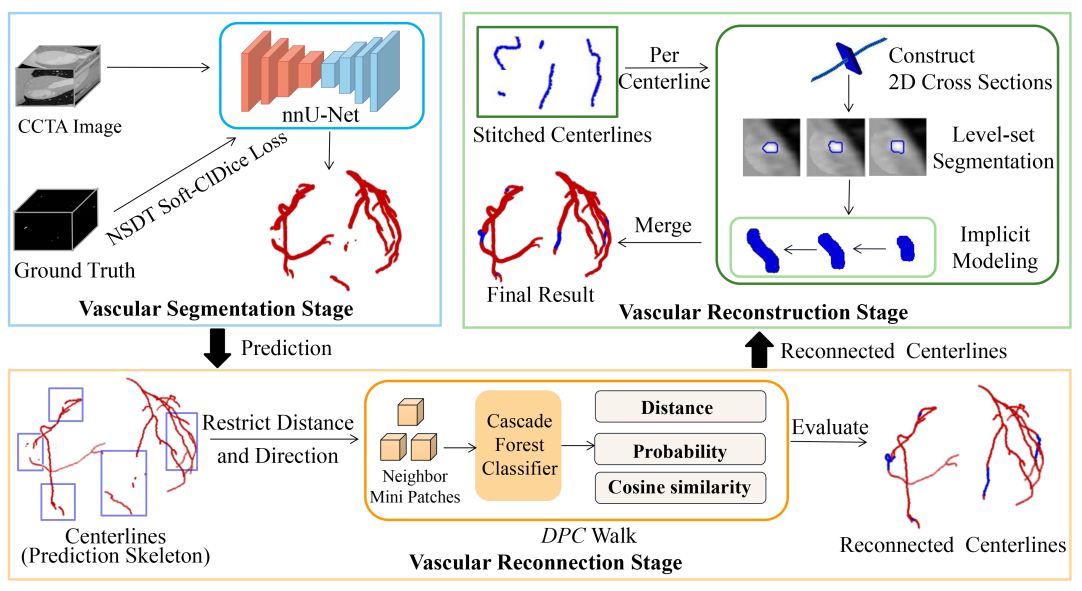论文提出了一个从CT血管造影中提取完全连通的冠状动脉的方案(CorSegRec),用于实现冠状动脉等管状结构的准确提取。在所提方法中,我们通过三个阶段得到连通性良好的完整冠状动脉树:血管分割阶段、血管(中心线)重连阶段和血管重建阶段。分割阶段的基于骨架距离变换的中心线增强损失函数提高了分割血管的连通性;重连阶段使用的距离-中心线概率-余弦相似度(DPC)游走算法,对冠脉初始分割中的断裂血管与两个最大连通分支进行连接;重建阶段沿着“缝补”的中心线进行了管腔模型重建。我们在两个冠脉CT造影数据集上将提出的方法与其他方法进行了比较,实验结果表明论文所提出的方法可以达到最先进的性能水平,提高了冠状动脉管状结构提取的准确性与连通性。