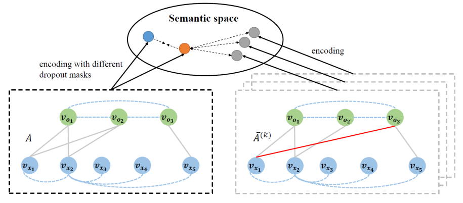 针对这个问题,如图1所示,本研究提出一种统一的多模态图来建模输入的文本和图片对,将两种模态中的语义单元(图片中的物体和文本中的词)建模为图结构中的节点。对于同模态的节点,采用全连接的图结构;对于跨模态的节点,则采用视觉定位工具来建立跨模态语义连边。基于此多模态图结构,使用图神经网络的特征融合层迭代地进行模态内和模态间的信息传播和融合,用于学习图结点的语义表示,解码器仅需要关注文本模态节点生成译文。此部分研究发表在自然语言处理国际会议ACL2020。为了充分利用多模态训练实例,本研究进一步引入了渐进式对比学习策略来增强多模态图表示学习。如图2所示,对于每个训练实例,正样本为输入多模态图结构经过dropout扰动的表示。负样本包括随机选择的负样本,即同一批次中的其他多模态图,以及困难的负样本,通过破坏图的跨模态对齐或视觉特征构建而成。通过训练模型拉近表示空间中的实例和正样本,同时将其与负样本区分开来。为了获得更平滑的训练过程,在训练中逐渐增加困难负样本的数量,以一种由易到难的方式有效地完善模型训练。在Multi30K数据集上的实验结果和深入分析验证了本研究提出模型和方法的有效性。