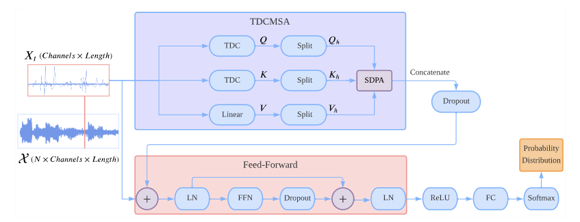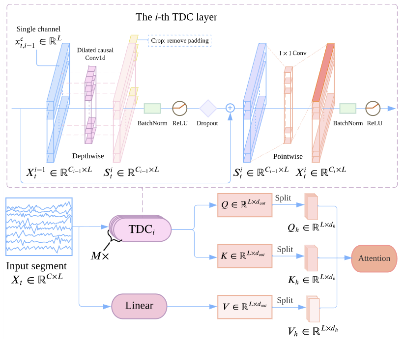 针对这些问题,本论文提出了一种基于 Transformer的稀疏sEMG识别网络TDCT(图1)。利用该网络,只需较少的卷积参数和较低的计算成本,就能实现更高的识别准确率。具体来说,该网络具有并行能力,可以捕捉 sEMG 信号内部的长程特征。如图2所示,通过提出的时序深度卷积(TDC)取代线性变换,我们改进了用于 sEMG 建模的多头自注意(MSA)的局部特征提取和通道相关性捕捉,从而降低了卷积参数量和计算量,提高了特征学习性能。我们在四个 sEMG 基准数据集评估和比较了TDCT。结果表明,在识别稀疏 sEMG 原始信号方面,我们的网络在大多数时间窗口都优于其他方法,从而证明了我们方法的先进性和有效性。