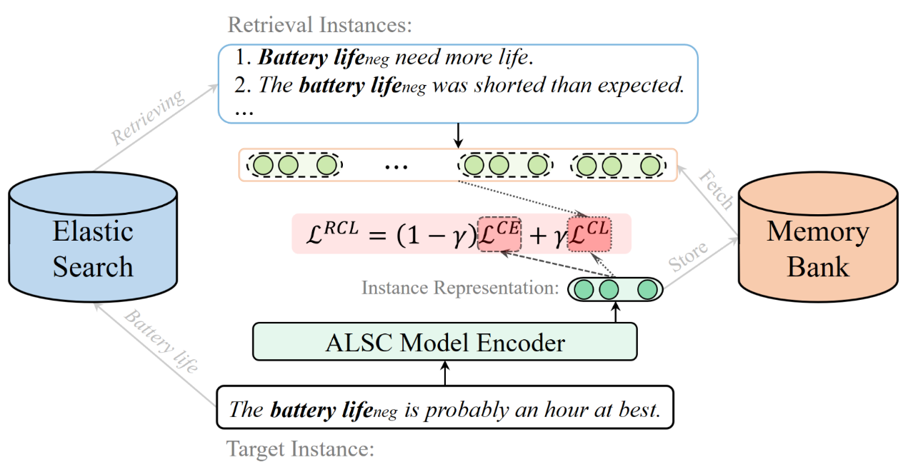 情感计算(Affective Computation)是人工智能领域重要的研究内容之一,细粒度属性级情感分析(ALSC)是情感计算研究的基石。目前,ALSC深度学习方法大都关注于单个句子进行属性相关的语义建模,忽略了具有相同属性的句子之间内在语义相关性,导致学习到的句子语义是不完善或者次优的,限制了ALSC模型的性能。针对这个问题,本文提出一种基于检索的对比学习训练方法(RCL),能够使得训练后的模型建模出更加鲁棒的句子情感语义表示。如图1所示,RCL支持大部分ALSC模型,以提高原有模型的性能。具体来说,在训练过程中,RCL以现有的ALSC模型为编码器生成输入句子语义表示,使用ElasticSearch进行相似句子的快速检索,采用Memory Bank存储和提取检索样本表示,以避免额外的计算代价。然后,采用对比学习技术学习出输入句子和相似句子之间的共同特征,以实现句子情感语义表示的精炼。我们在三个广泛使用的ALSC数据集上验证了RCL训练方法的有效性。