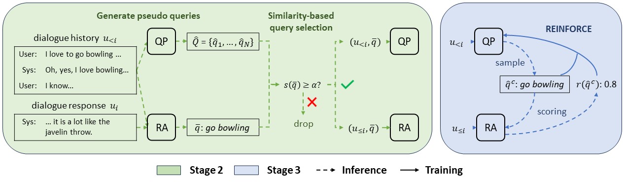 本工作聚焦半监督对话查询生成任务,其中对话查询生成基于对话历史生成搜索查询,有助于模型检索和获取外部知识。而现有的对话查询生成工作主要关注标注数据收集和模型监督训练,存在数据稀缺和领域适应的问题。研究表明,引入对话回复作为额外输入,模型预测性能往往更佳,这可用于生成伪查询参与半监督训练。但模型有时会过度依赖回复信息,从而产生一些低质量的伪查询。鉴于上述问题,本工作首次提出一种三阶段的半监督对话查询生成训练框架SemiDQG。在阶段1,本工作使用标注数据训练标准查询生成器(QP)和回复增强查询生成器(RA)。在阶段2,本工作使用QP和RA为无标注数据生成伪查询,基于相似度挑选RA生成的高质量伪查询来构造伪实例,用于训练QP和RA。在阶段3,本工作引入强化学习,利用RA为QP采样得到的候选查询打分,从而为QP提供细粒度的训练信号,进一步训练QP。本工作在中英文三个基准数据集上进行实验,充分分析讨论了SemiDQG在跨领域和低资源场景上的表现,证明了训练框架的有效性。