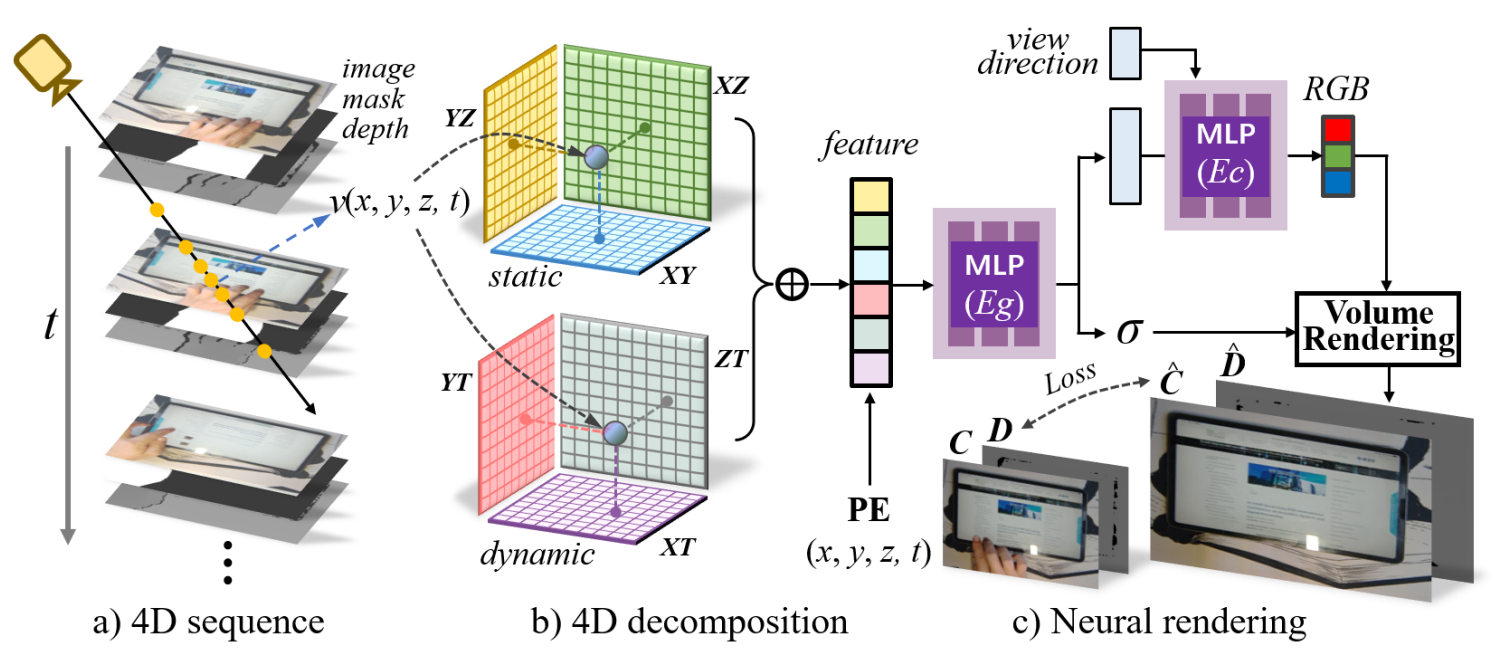本工作研究固定单目相机的动态场景快速重建问题,与利用多视图观测构建场景表示相比,从固定单视角快速建模动态场景拥有更多限制。受神经渲染最新进展的启发,本工作提出了一种新的框架来解决单目相机中动态场景的4D分解问题。该框架利用分解的静态和动态特征平面来高效表示4D场景,并强调通过密集光线投射来学习动态区域。此外,来自单个视图的3D线索不足和遮挡也是场景重建中的特殊挑战。为了克服这些困难,本工作提出了深度监督优化和光线投射策略。本工作在拍摄的6个单视角场景中验证了所提方法的有效性,与现有的单视图动态场景表示方法相比,重建的场景具有更高的质量,同时重建时间缩短了44倍。