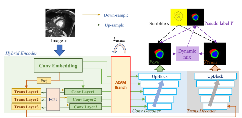 与基于全像素标记(fully-annotated)监督的方法相比,基于涂鸦(scribble)监督的医学图像分割任务的难度更大。为解决涂鸦监督医学图像分割的难点,论文提出了一种全新的CNN-Transformer混合模型 :ScribFormer。所提出的ScribFormer模型具有三个分支结构,即CNN分支、Transformer分支和注意力引导的类激活图(ACAM)分支。CNN分支与Transformer分支协作,将从CNN学到的局部特征与Transformer获取的全局表示融合在一起,这可以有效克服现有涂鸦监督分割方法的局限性。此外,ACAM分支有助于统一浅层卷积特征和深层卷积特征,进一步提高模型的性能。在两个公共数据集和一个私有数据集上进行的大量实验表明,我们的ScribFormer在涂鸦监督分割方法中表现优越,并且甚至比完全监督的分割方法取得了更好的结果。