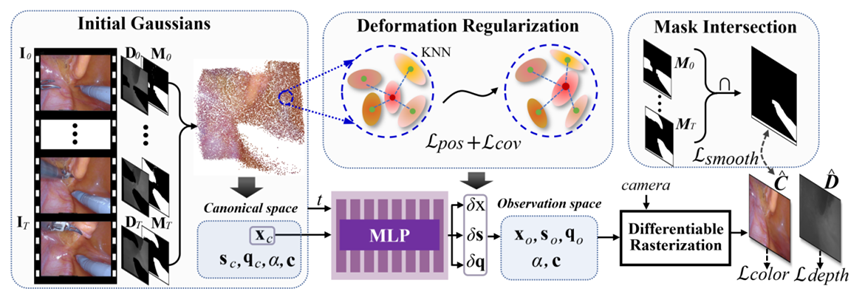 3.题目:SurgicalGaussian: Deformable 3D Gaussians for High-Fidelity Surgical Scene Reconstruction(作者:Weixing Xie, Junfeng Yao, Xianpeng Cao, Qiqin Lin, Zerui Tang, Xiao Dong, Xiaohu Guo;收录情况:MICCAI-2024主会长文)。本文由我中心2021级博士生谢卫星、姚俊峰教授、北师港浸大董潇助理教授和德克萨斯大学达拉斯分校郭小虎教授合作完成。