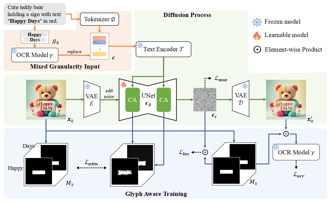 扩散模型在文生图领域取得了长足进步,但始终无法准确的在图片中绘制出文字。该工作聚焦于提升基座扩散模型的图片文字生成能力,在不降低模型整体图片生成质量的前提下,训练模型生成准确,美观,艺术的图片文字,并在中文文字生成上验证了方法的有效性。工作首先从先导实验出发,探究得到BPE分词对模型理解文字字形信息产生了负面影响,以及现有模型的注意力模块未能准确将文字token与图片文字部分进行对应。基于实验发现,文章进行了以下改进:1)提出了混合粒度的输入,将英文文字作为整体输入模型,将中文文字进行汉字级别分词,从而提供了更丰富的字形信息;2)提出了三个训练目标,提升模型对于图片文字区域信息的学习,以及对图片文字区域与文字token之间对应关系的学习。量化实验以及人工评测均表明该方法的有效性。