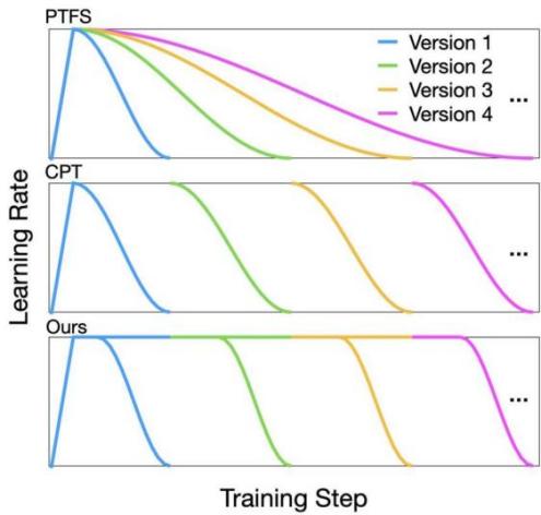 新数据的不断涌现使版本更新成为大语言模型不可或缺的需求。大语言模型版本更新的训练范式包括从头预训练和继续预训练。先导实验表明,从头预训练得到的大语言模型的预训练性能更好,而继续预训练的总训练成本更低,此外,两种范式的性能和训练成本之间的差距随着版本的更新而逐渐扩大。为了分析该现象的原因,我们分析在继续预训练的两个阶段调整学习率的效果:准备初始化检查点(checkpoint)和根据检查点进行预训练。我们发现,第一阶段较大的学习率和第二阶段完整的学习率衰减过程对于大语言模型的版本更新至关重要。因此,我们提出一种学习率路径切换训练范式。如图所示,我们的范式包括一条主路径和多条分支路径,前者以最大学习率预训练大语言模型,后者则是用新增的训练数据更新大语言模型。在训练4个版本的大语言模型时,与从头预训练相比,我们的范式将总训练成本降低至58%,同时保持了相当的预训练性能。此外,我们还验证了我们的范式的通用性,进一步证明了它的实用性。