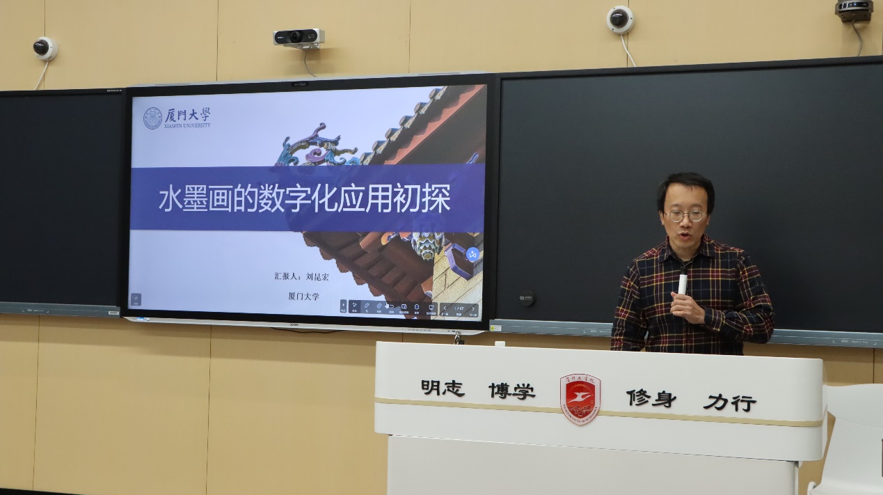 首先由厦门大学刘昆宏教授以“水墨画的数字化应用初探”为题作报告。他报告了:近年在文旅领域应用研究中,课题组围绕不同风格水墨画的数字化应用研究进行探索,通过融合虚拟现实、生成式人工智能等技术,针对不同类型水墨画的要素与特点,设计多种方案进行画中的关键特征抽取,在此基础上展开二次创作。课题组的初步探索在一定程度上取得了预期的应用效果。