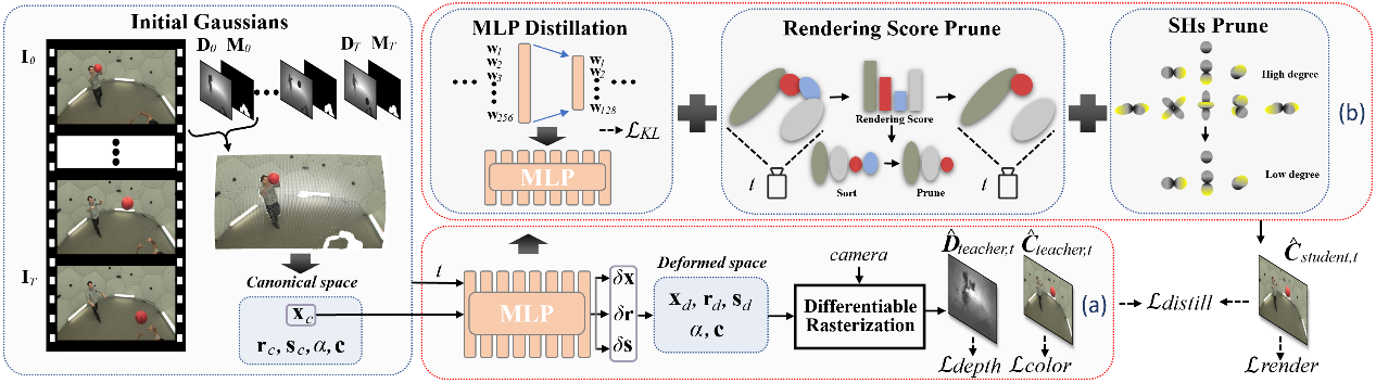 最近的可变形三维高斯方法实现了高质量的重建和实时渲染。然而,它们需要多视角信息,并且不适用于从手机捕获的单视角动态场景。此外,变形MLP的高维隐藏层以及过多的高斯基元和属性带来了显著的存储压力,极大地限制了它们的实际应用。为了解决这些问题,我们提出了一种新颖的轻量级可变形三维高斯师生框架。具体来说,我们采用针对单视角场景设计的初始化策略来初始化高斯基元,然后利用颜色和深度信息优化教师模型。对于训练好的教师模型,我们进行变形MLP的蒸馏、高斯基元和高斯属性的剪枝,最终获得一个存储需求低且高效的学生模型。公开基准实验证明了我们框架的有效性,显示了超过4倍的压缩率,同时保持了令人满意的渲染质量。