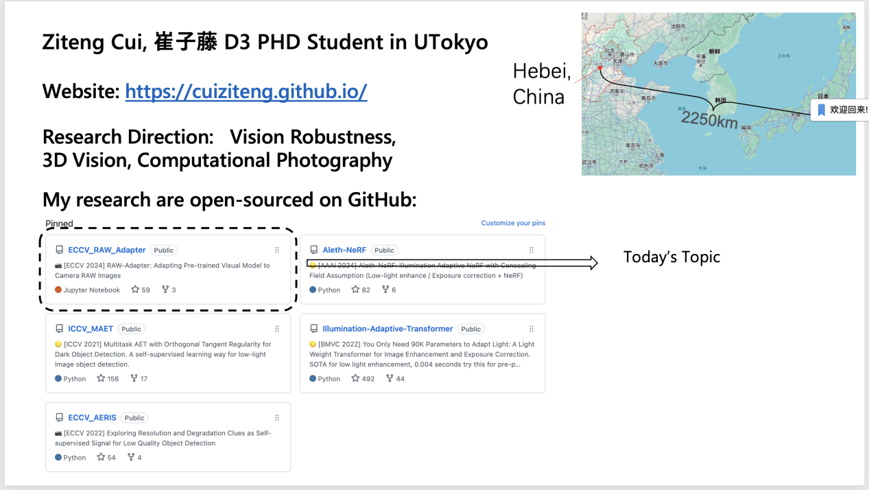 东京大学计算机科学系博士生崔子藤的演讲题目是RAW-Adapter:将sRGB预训练模型适配至相机RAW数据。崔博士提出的RAW-Adapter方法,旨在提升视觉模型在复杂光照条件下的表现,探讨该方法如何通过引入可学习的图像信号处理阶段,改善低质量视觉数据的处理效果。