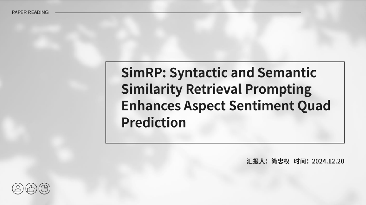 厦门大学电影学院的博士生简忠权介绍了他提出的SimRP方法,通过语法和语义相似性检索,增强大语言模型在预测情感四元组(Aspect Sentiment Quad Prediction, ASQP)中的能力。该方法通过构建有效的提示(prompt),帮助模型更准确地识别情感四元组中的各个元素,提升了情感分析的准确性和鲁棒性。简博士展示了该方法在实际应用中的优势,并探讨其对大语言模型发展的潜力。