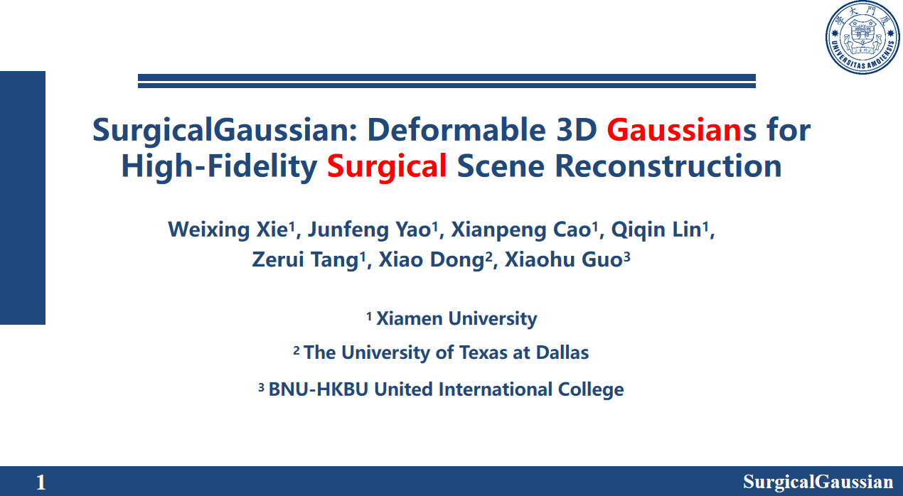 厦门大学电影学院博士生谢卫星介绍了他构建的SurgicalGaussian方法,利用3D高斯点云技术对手术场景进行高保真重建。该技术通过模拟软组织的时空特征,解决了传统神经辐射场(NeRF)在处理手术场景时的局限性,尤其是面对手术器械遮挡和复杂场景动态变化时的挑战。演讲将展示这一创新方法如何提升机器人手术中的实时渲染精度与可靠性。