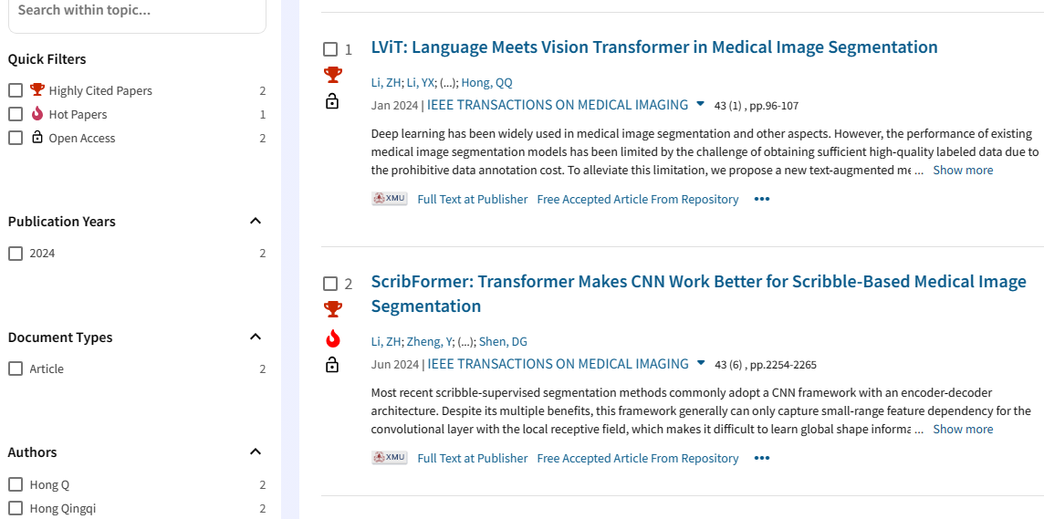 近日,我中心洪清启老师2篇论文入选ESI(基本科学指标)高被引论文(Highly Cited Papers)Top 1%,其中有1篇同时也是ESI热点论文(Hot Papers)Top 0.1%。这2篇论文都是2024年发表在IEEE Transactions on Medical Imaging(TMI)期刊上的。TMI是计算机:跨学科应用、医学图像处理领域的顶级期刊,属于中科院一区期刊。
