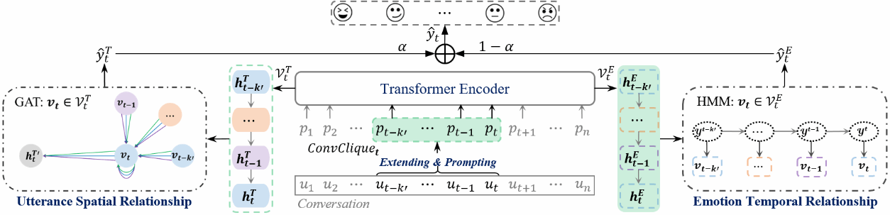 对话中的情感识别(ERC)是一项具有挑战性的任务,原因在于上下文信息在各话语中的稀缺性和分散性。大多数现有的方法试图整合全面的信息以增强话语语义,然而这也会引入噪声和不相关的内容,误导模型并限制其在情感识别方面的潜力。为此,我们引入了对话团(ConvClique)的概念,并提出了CC-ERC。这是一种多视角情感知识提取方法,旨在从互补的角度捕捉对话团中最相关的情感线索,并协同预测话语情感。具体而言,CC-ERC包含两个模块:1)话语空间关系(USR)模块,通过建模话语之间的结构相关性来预测情感;2)情感时间关系(ETR)模块,捕捉情感序列模式以确定话语情感。在三个广泛使用的ERC数据集上对CC-ERC的有效性进行了验证,评估了在线和离线两种设置。与最先进的方法相比,CC-ERC在准确率上平均提高了0.63%,在加权F1分数上平均提高了0.94%。消融研究进一步验证了基于ConvClique的知识提取的重要性,并展示了USR和ETR模块在建模话语结构相关性和情绪序列模式方面的有效性。
