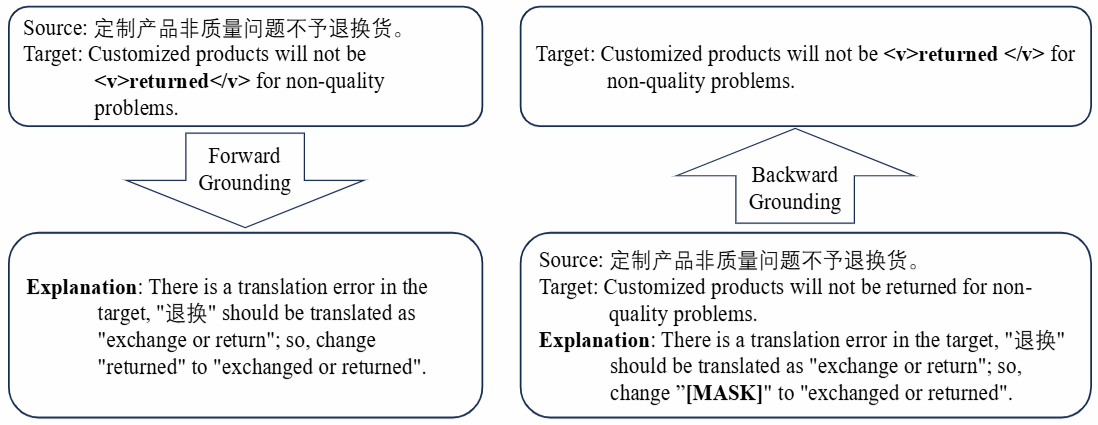 论文简介:当前机器翻译错误分析虽能定位错误,却缺乏对错误原因的系统化解译,导致基于LLM的自动分析方法存在解释可信度低、主观偏差大的缺陷。为此,本文提出双向锚定方案,通过构建首个手动标注的翻译错误解释评估资源,实现错误与原因的相互验证。本文首先设定前向锚定人工标注错误原因,后向锚定通过掩码解释反向定位错误,双向不一致时校准边界。同时,强制标注源语片段/修正片段等关键元素,设计错误专用模板,保障解释一致性。最后,本文基于4K条中英/英德实例验证LLM缺陷,进一步提出迭代双向锚定算法过滤误报,显著提升机器翻译错误检测能力。