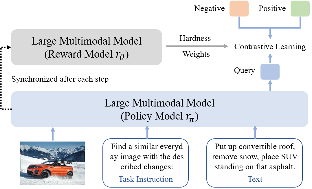 当前多模态嵌入模型在交错图文检索、多模态RAG以及聚类等任务中发挥着关键作用。然而,我们的实证研究发现,现有基于多模态大模型(LMM)的嵌入方法采用标准InfoNCE损失训练时,正负样本之间的相似性分布高度重叠,难以有效区分困难负样本。针对这一问题,本研究提出了一种简单高效的动态负样本加权训练框架,使嵌入模型能够根据负样本判别难度自适应提升对难样本的表示学习。具体而言,我们将嵌入模型视为策略模型,并引入独立的奖励模型,为每个负样本分配自适应权重,判别难度越大权重越高,从而推动模型更关注难负例对的特征学习。分析实验进一步表明,该方法显著扩大了正负样本相似性分布的区分度,助力模型学习更具辨识力的多模态表示。在覆盖4大元任务、36个数据集的多模态嵌入基准(MMEB)上的实验结果显示,LLaVE系列模型在相同大小的模型下都达到最佳的性能。