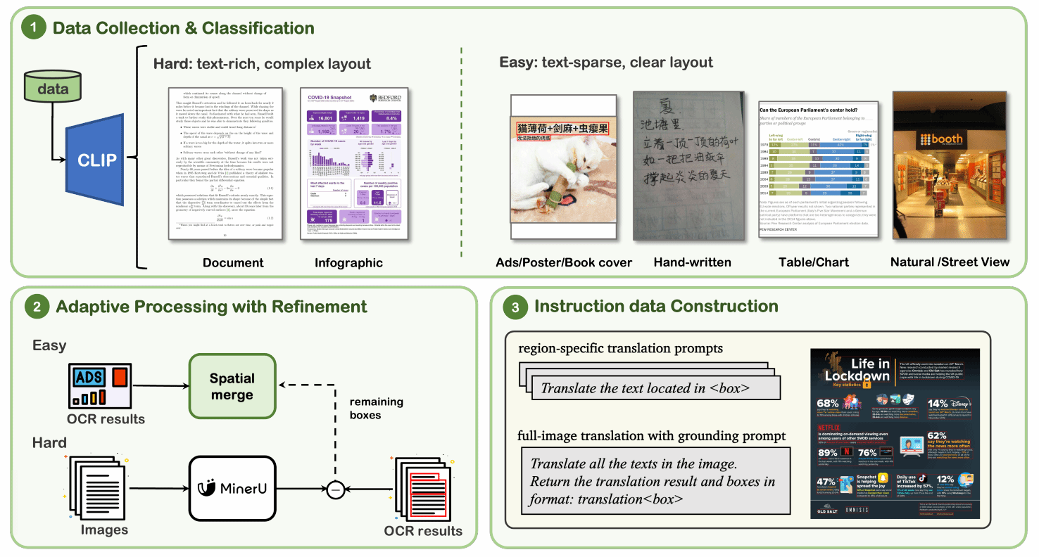 当前文本图像机器翻译(TIMT)研究主要关注将图像中的文本翻译成另一种语言,但现有方法大多忽视了文本的位置信息,且聚焦单一场景的翻译。基于此,我们提出了位置感知文本图像机器翻译(PATIMT)任务,其中包含两个关键子任务:区域特定翻译和全图翻译与定位。为支持现有模型在PATIMT任务上的应用并进行公平评估,我们构建了PATIMT基准(PATIMT-Bench),涵盖10种不同的真实场景。此外,本文引入了一种自适应图像OCR精炼流程,根据场景选择合适的OCR工具,并对文本丰富的图像结果进行精炼。为确保评估的可靠性,我们还构建了一个包含1200个高质量实例的手动标注测试集。实验结果显示,主流的视觉语言模型经过PATIMT-Bench训练数据微调后在两个子任务上均有明显的提升。此外,进一步的实验表明我们的训练数据具有可扩展性和泛化性。