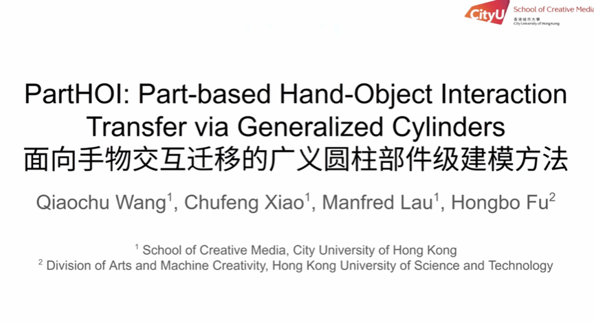 香港城市大学创意媒体学院的王翘楚博士生分享了 PartHOI 部件级建模方法。该研究专注于捕捉人手与物体交互时的细微联系,通过精细化建模实现了从静态数据到真实动态交互的知识迁移,对于虚拟现实互动和机器人仿生抓取具有实际应用价值。