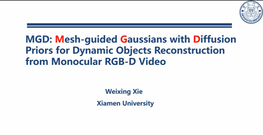 厦门大学的谢卫星博士生分享了 MGD 动态重建算法。他利用场景自适应扩散先验,实现了从普通 RGB-D 视频中生成高保真动态三维场景。该技术除了在视觉识别领域具有学术价值外,还可应用于手术场景重建等精密任务中。