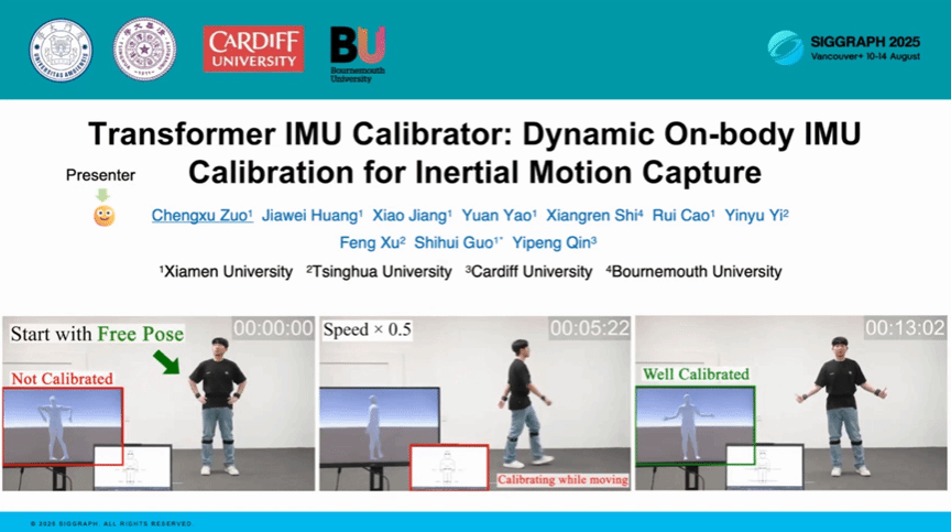 厦门大学信息学院的姚远博士生展示了荣获 SIGGRAPH 2025 最佳论文奖的成果:Transformer IMU Calibrator。该研究解决了传统惯性动捕设备需要复杂标定动作的痛点,实现了在人体自然活动中的动态标定。这一技术将降低运动健身、虚拟社交等领域使用动捕设备的门槛。
