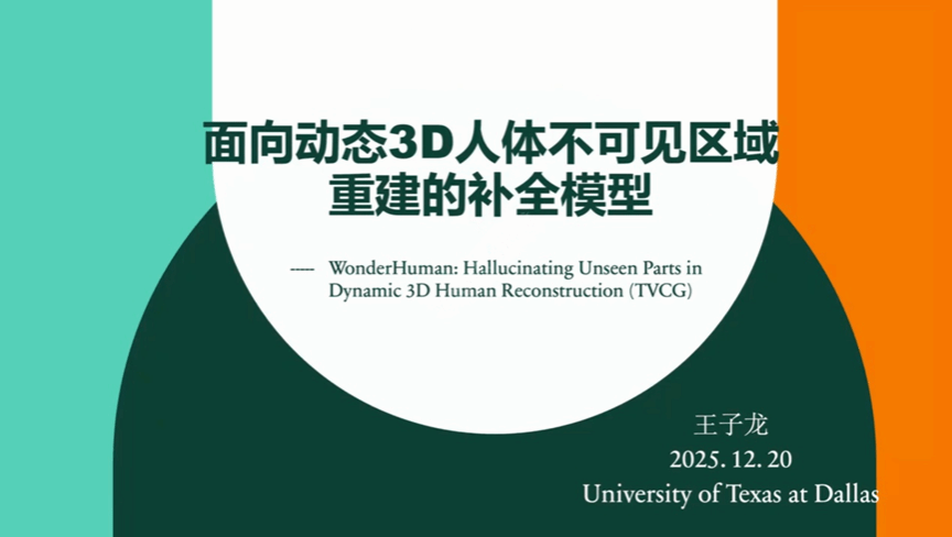 德克萨斯大学达拉斯分校的王子龙博士生发表了关于 WonderHuman 动态人体重建的研究。针对单目图像信息缺失导致的盲区,该系统能够推断并补全未观测区域的完整形态,使得三维人体建模在单一视角下依然保持完整与逼真。