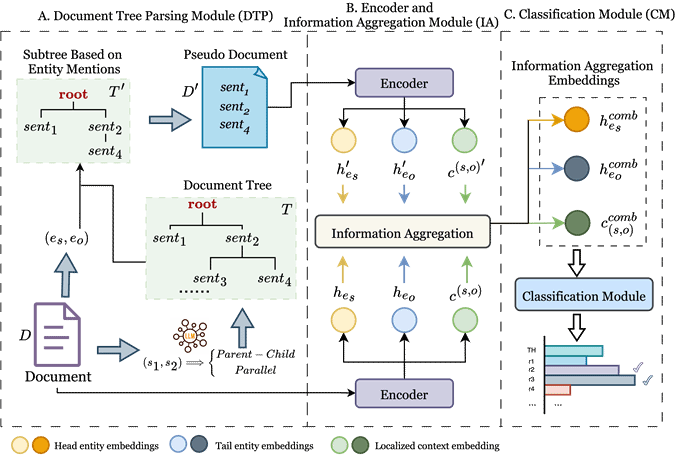 随着非结构化文本分析需求的日益增长,从长文档中识别实体间复杂语义关系的文档级关系抽取(DocRE)任务,已成为信息抽取领域的一项关键而极具挑战性的课题。受限于关系证据的局部化特征与长文本的冗余性,现有将整篇文档作为输入的方法往往引入大量无关上下文噪声,导致模型在处理长距离依赖时难以兼顾抽取精度与推理效率。针对这一问题,我们提出了一种新的文档级关系抽取框架——DTPE(Document Tree Parsing for Efficient Document-level Relation Extraction)。该框架融合了大语言模型(LLM)与 Transformer 架构,首先引入文档树解析模块(Document Tree Parsing Module),利用LLM 将非结构化文档解析为具有层级结构的文档树。针对每一对实体,通过构建仅包含关键证据的最简子树并生成精简的“伪文档”(Pseudo-document),在显著降低输入长度的同时有效保留了核心上下文信息。在此基础上,DTPE 进一步引入互补的信息聚合模块(Information Aggregation Module),通过整合原始文档的全局特征,弥补了局部视角的潜在信息缺失。此外,基于 LLM 的语料库精炼策略(Corpus Refinement via LLM)通过自动修正远程监督数据中的噪声标签,进一步提升了预训练阶段的数据质量与模型鲁棒性。大量实验结果表明,DTPE 在DocRED 和Re-DocRED等主流数据集上均取得了优于现有方法的SOTA 性能,特别是在长文档场景下优势显著,提供了一种高效且精准的新解决方案。