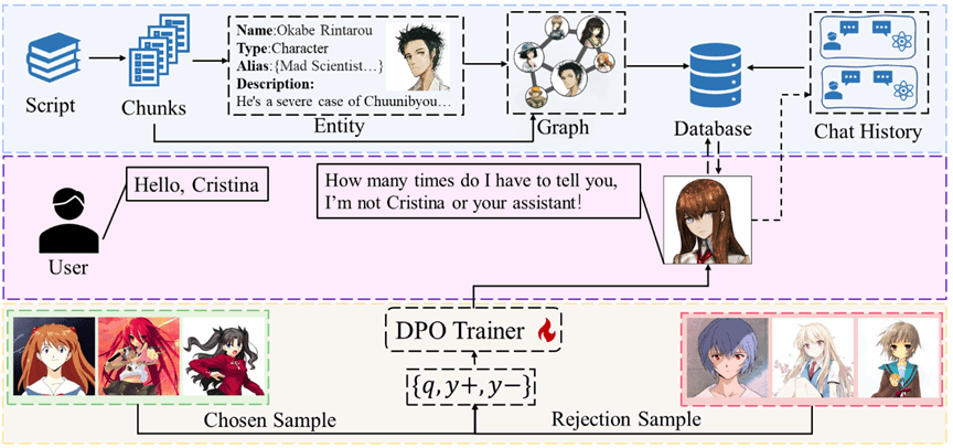 近年来,大型语言模型(LLMs)因其理解人类指令并生成高质量文本的能力,在角色扮演领域得到广泛应用。然而,开发高效的角色扮演型LLMs需要准确检索背景故事与对话历史,同时生成符合角色人设的内容。我们提出一种融合检索增强生成(Retrieval-Augmented Generation,RAG)与直接偏好优化(Direct Preference Optimization, DPO)的统一框架,以解决知识保留与人格一致性难题。RAG通过知识图谱和向量数据库管理角色知识与对话历史,DPO则优化模型策略以增强角色表现力。通过训练对比性角色对话,本框架显著提升了人格一致性并减少了幻觉现象。实验结果表明,DR.Roleplay在角色一致性与对话生成质量方面显著优于基线方法。