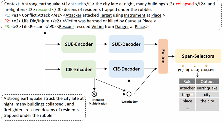 文档级事件论元抽取(Document-level Event Argument Extraction, EAE)旨在在整个文档范围内,给定事件触发词识别其对应的论元。现实世界的文本通常包含多个相互关联的事件,然而现有方法大多侧重于单事件建模或局部触发词–角色交互,这使得模型容易产生角色混淆,且难以捕获跨事件的依赖关系。为了解决上述问题,我们提出了一种统一的框架,引入多事件提示机制,对多个事件进行联合处理,从而更好地建模事件之间的关联关系。进一步地,我们设计了两个互补的模块:语义理解增强(Semantic Understanding Enhancement, SUE)模块,通过将论元槽位与相关词元对齐以减少语义歧义;以及上下文信息增强(Context Information Enhancement, CIE)模块,用于聚合跨句子和跨事件的信息信号,以支持文档级推理。此外,我们提出了一种基于概率的动态融合机制,能够自适应地平衡SUE 模块的语义精确性与CIE 模块的上下文鲁棒性。在三个基准数据集上的大量实验结果表明,该方法在强基线模型之上取得了显著性能提升,验证了所提出方法的有效性。