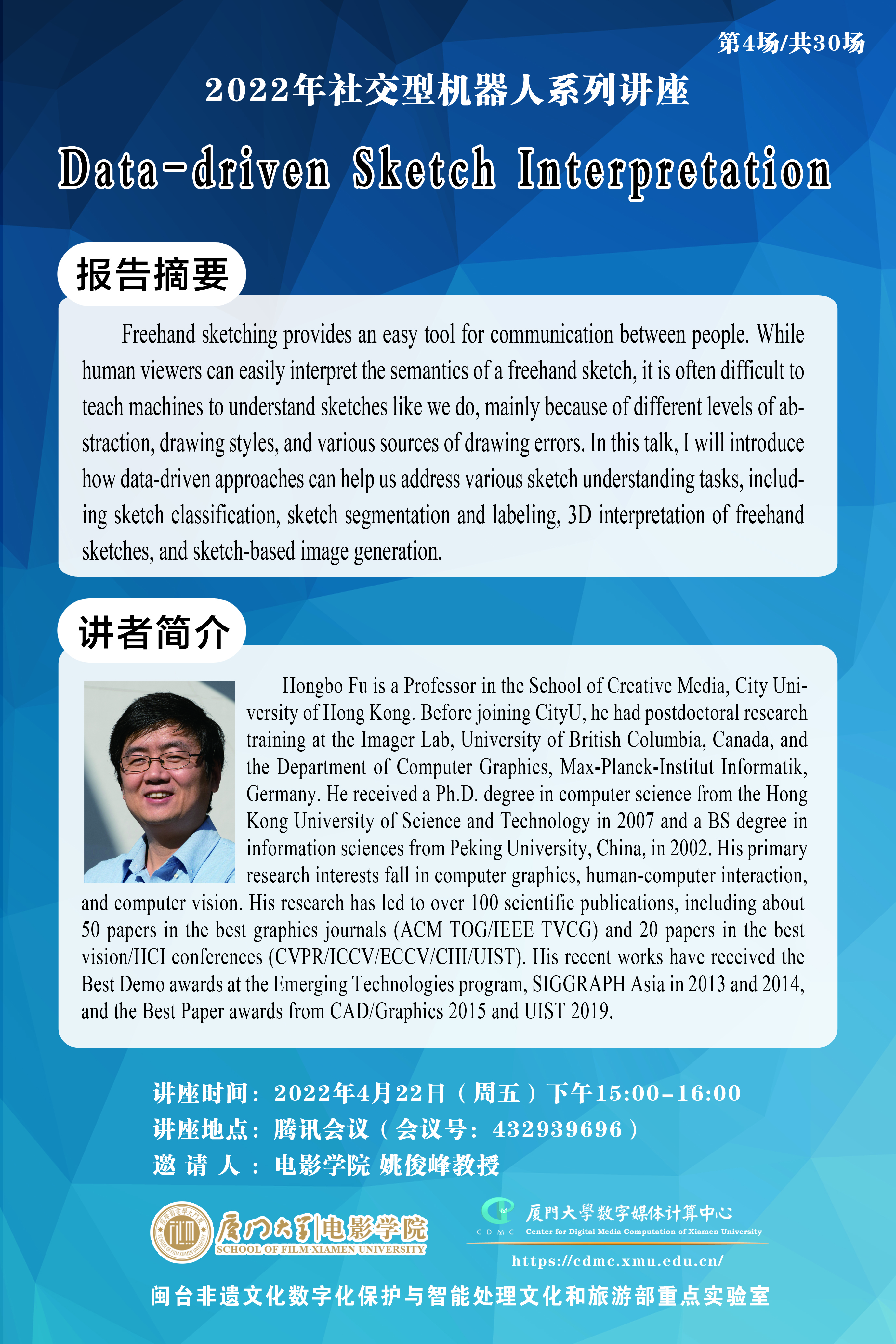 Hongbo Fu is a Professor in the School of Creative Media, City University of Hong Kong. Before joining CityU, he had postdoctoral research training at the Imager Lab, University of British Columbia, Canada, and the Department of Computer Graphics, Max-Planck-Institut Informatik, Germany. He received a Ph.D. degree in computer science from the Hong Kong University of Science and Technology in 2007 and a BS degree in information sciences from Peking University, China, in 2002. His primary research interests fall in computer graphics, human-computer interaction, and computer vision. His research has led to over 100 scientific publications, including about 50 papers in the best graphics journals (ACM TOG/IEEE TVCG) and 20 papers in the best vision/HCI conferences (CVPR/ICCV/ECCV/CHI/UIST). His recent works have received the Best Demo awards at the Emerging Technologies program, SIGGRAPH Asia in 2013 and 2014, and the Best Paper awards from CAD/Graphics 2015 and UIST 2019.