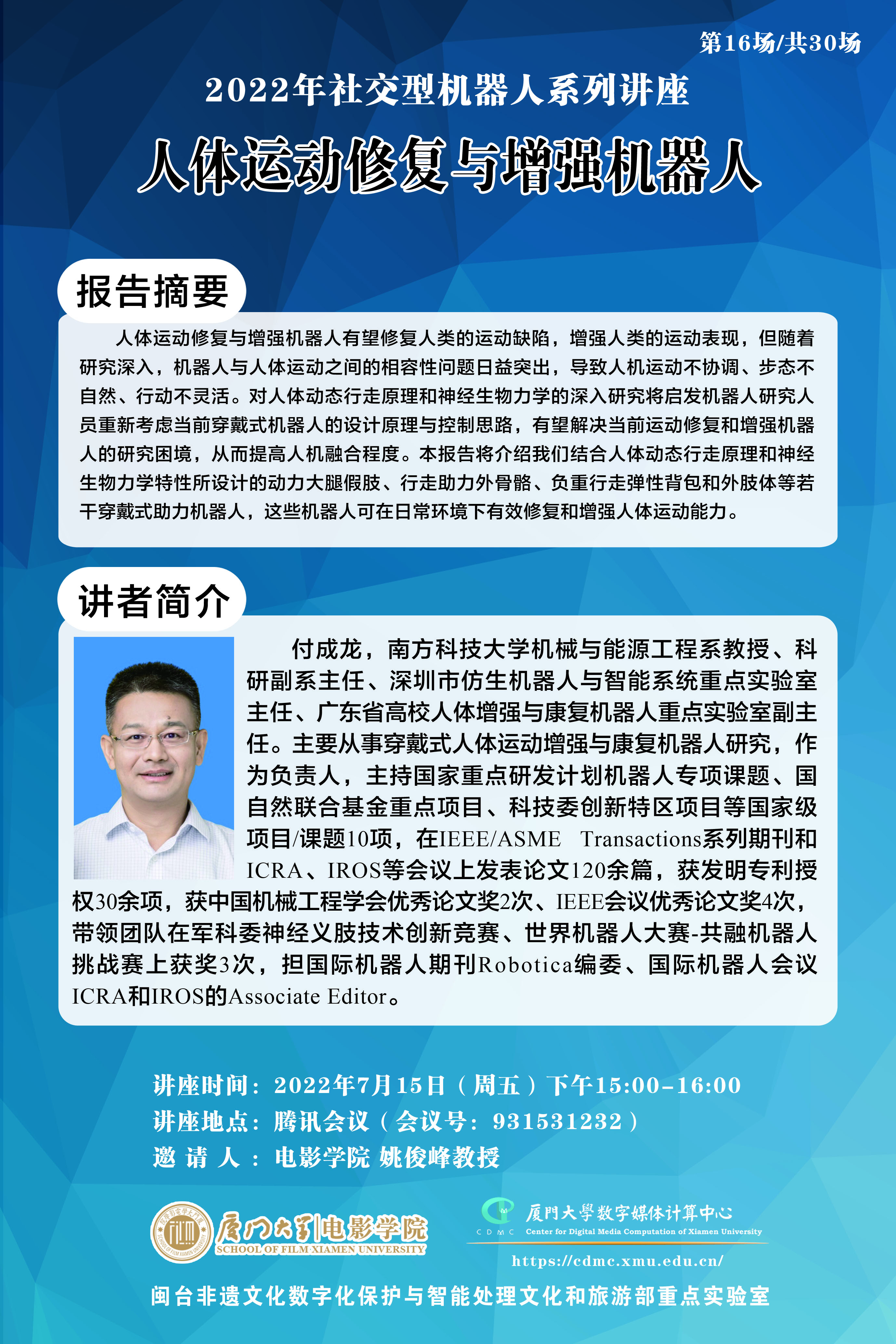 人体运动修复与增强机器人有望修复人类的运动缺陷,增强人类的运动表现,但随着研究深入,机器人与人体运动之间的相容性问题日益突出,导致人机运动不协调、步态不自然、行动不灵活。对人体动态行走原理和神经生物力学的深入研究将启发机器人研究人员重新考虑当前穿戴式机器人的设计原理与控制思路,有望解决当前运动修复和增强机器人的研究困境,从而提高人机融合程度。本报告将介绍我们结合人体动态行走原理和神经生物力学特性所设计的动力大腿假肢、行走助力外骨骼、负重行走弹性背包和外肢体等若干穿戴式助力机器人,这些机器人可在日常环境下有效修复和增强人体运动能力。