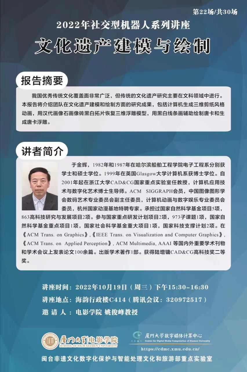 讲者简介:于金辉,1982年和1987年在哈尔滨船舶工程学院电子工程系分别获学士和硕士学位。1999年在英国Glasgow大学计算机系获博士学位。自2001年起在浙江大学CAD&CG国家重点实验室任教授,计算机应用技术与数字化艺术博士生导师。ACM SIGGRAPH会员,中国图像图形学会数码艺术专业委员会副主任委员,计算机动画与数字娱乐专业委员会委员,杭州国家动漫基地特聘专家。承担过国家自然科学基金项目5项,863高科技研究与发展项目2项。参与国家重点研发计划项目2项,973子课题1项,国家自然科学基金重点项目1项,国家社会科学基金重大项目1项,国家科技支撑计划2项。在《ACM Trans. on Graphics》,《IEEE Trans. on Visualization and Computer Graphics》, 《ACM Trans. on Applied Perception》, ACM Multimedia, AAAI 等国内外重要学术刊物和学术会议上发表论文100余篇。出版学术著作1部。获得陆增镛CAD&CG高科技奖二等奖。