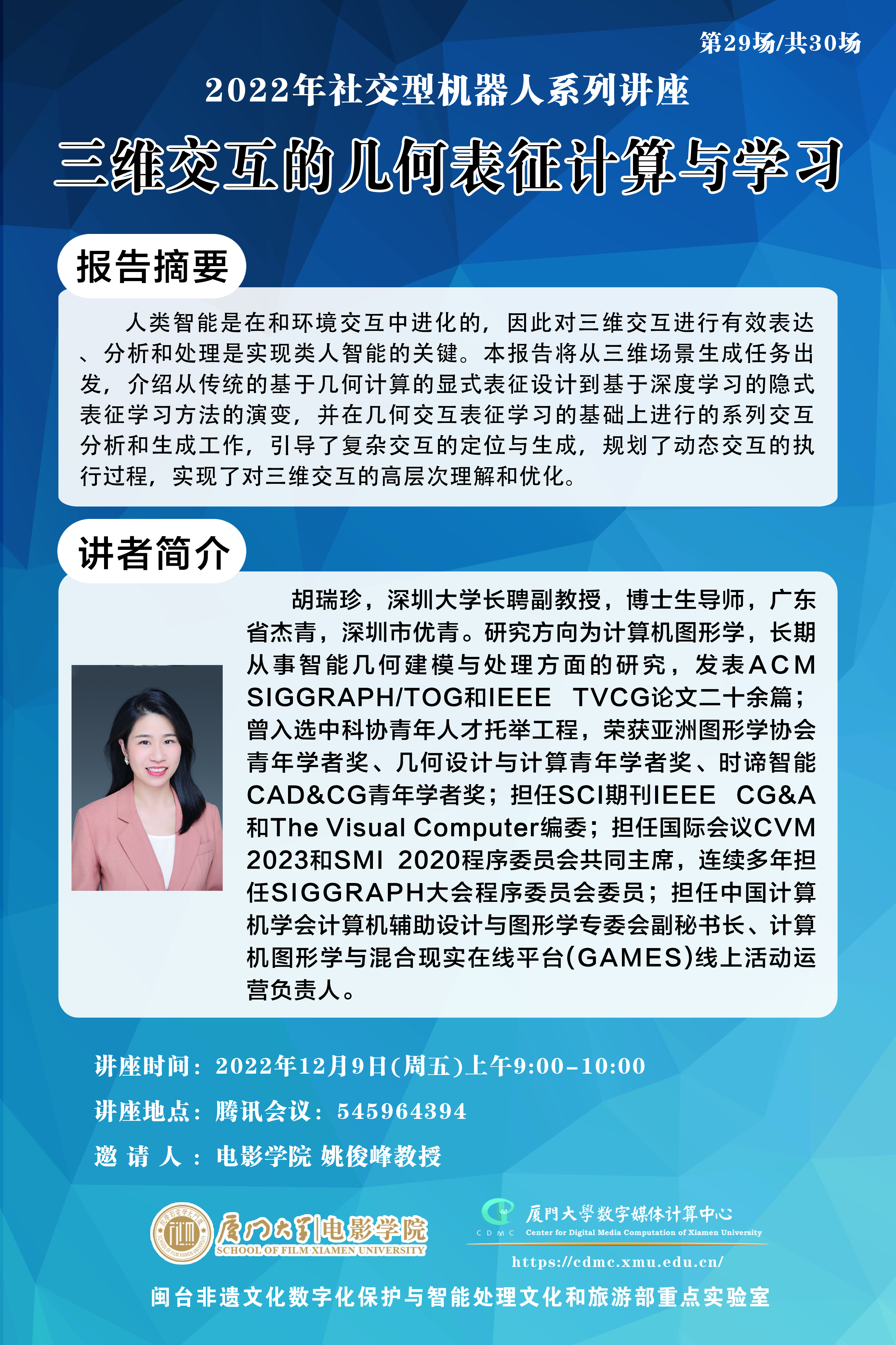 胡瑞珍,深圳大学长聘副教授,博士生导师,广东省杰青,深圳市优青。研究方向为计算机图形学,长期从事智能几何建模与处理方面的研究,发表ACM SIGGRAPH/TOG和IEEE TVCG论文二十余篇;曾入选中科协青年人才托举工程,荣获亚洲图形学协会青年学者奖、几何设计与计算青年学者奖、时谛智能CAD&CG青年学者奖;担任SCI期刊IEEE CG&A和The Visual Computer编委;担任国际会议CVM 2023和SMI 2020程序委员会共同主席,连续多年担任SIGGRAPH大会程序委员会委员;担任中国计算机学会计算机辅助设计与图形学专委会副秘书长、计算机图形学与混合现实在线平台(GAMES)线上活动运营负责人。